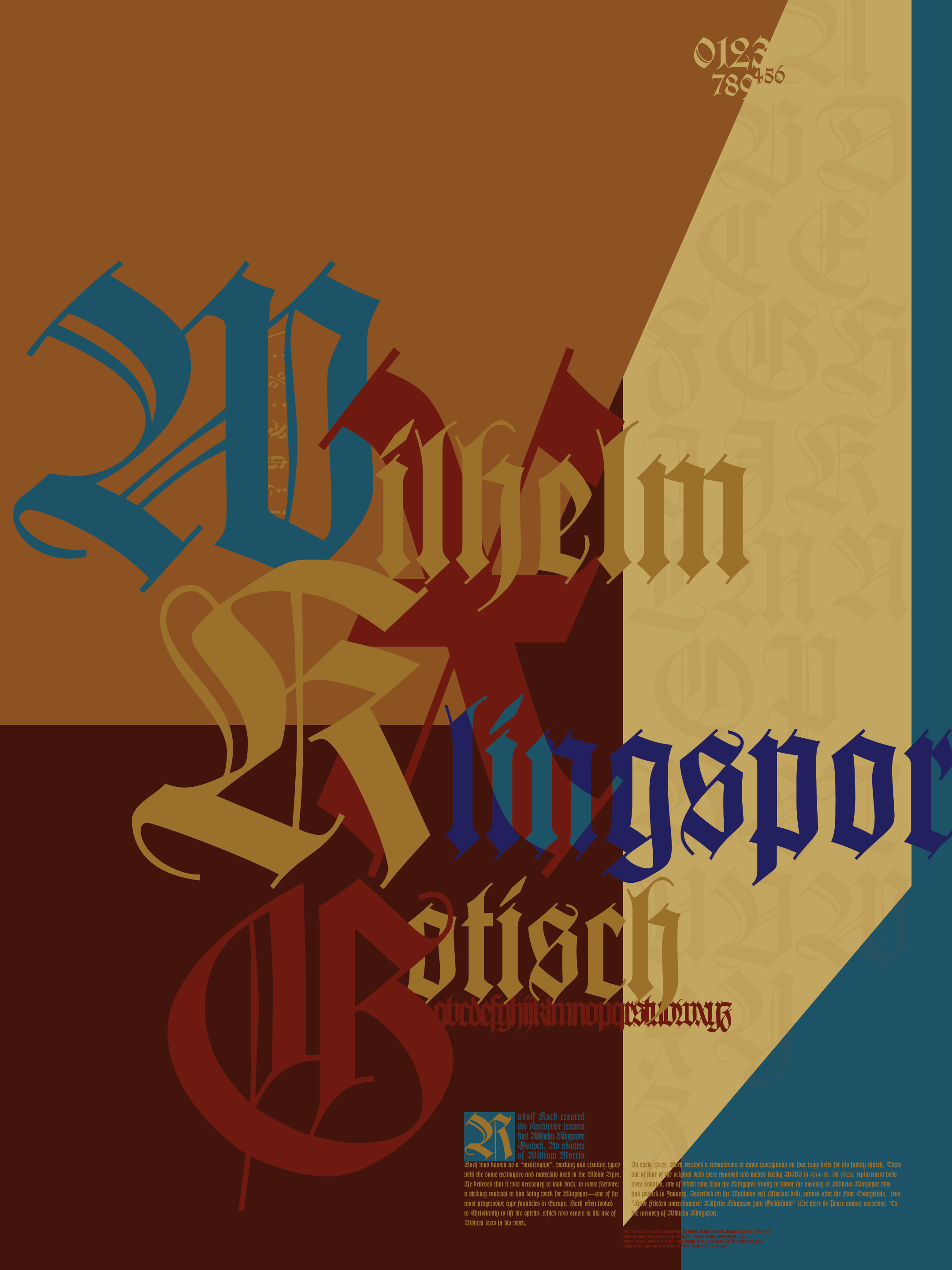 This piece explores the history of the font Wilhelm Klingspor Gotisch and its creator Rudolf Koch. Its design derives inspiration from the media of its time under a contemporary eye.